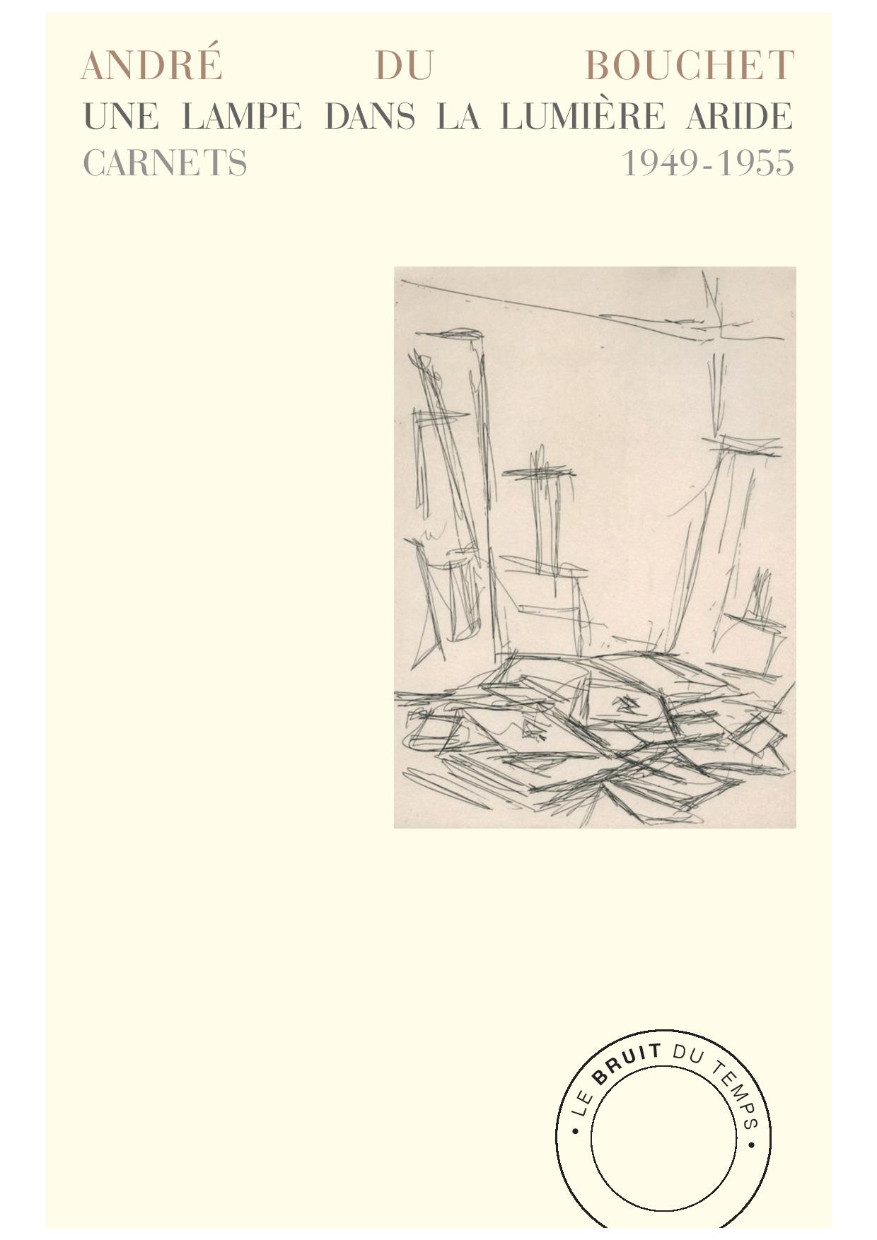 Une lampe dans la lumière aride reproduit une grande part des carnets que le poète tint presque quotidiennement entre 1949 et 1955. Après les années de formation intellectuelle et d’exil que furent celles de sa vie aux États-Unis, du Bouchet découvre, au cours de cette période d’intense création poétique, ce qui deviendra sa propre voix. Sous la plume du jeune homme qui rêve d’abord de devenir poète, on voit, en l’espace de quelques mois, la métamorphose s’opérer. Alors que les premières notes sont encore souvent des transpositions de rêve, donnant lieu à des ébauches poétiques qui pourraient faire penser au surréalisme, la tonalité se singularise soudainement, lorsque du Bouchet décide de ne plus consigner aucune mention biographique, ni aucun événement immédiatement identifiable. Ce ne sont plus alors que des « annotations sur l’espace », comme il l’écrira lui-même plus tard, c’est-à-dire des formulations toujours nouvelles disant comment la perception humaine s’inscrit dans une relation première avec l’espace et se manifeste à travers le temps. La marche a remplacé le rêve.
